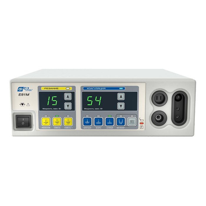Базовая комплектация аппарата: № п/п Наименование Кол-во 1 Е81МВ ВЧ электрохирургический блок, 90 Вт; моно: РЕЗАНИЕ, СМЕСЬ, СМЕСЬ1, МЯГКАЯ, ФОРС, СПРЕЙ; биполяр: БИ-КОАГ, АВТО-СТОП, пуск с руки 1 шт 2 ЕР202 Педаль двухклавишная 1 шт 3 ЕН230 Нейтральный электрод с кабелем ( амбулаторное применение, длина кабеля 3 м) 1 шт 4 ЕН232.1 Нейтральный электрод из токопроводящей резины (180 х 120 мм, 216 см кв.) 1 шт 5 ЕН235 Нейтральный электрод двухсекционный одноразовый (25 шт/кор.) 1 шт 6 ЕН234.1 Держатель нейтрального электрода «джек» (длина кабеля 3 м) 1 шт 7 ЕН236 Держатель нейтрального одно- и двухсекционного электрода «джек» (длина кабеля 3 м) 1 шт 8 ЕН341-3 Держатель монополярных электродов. Инструментальная часть - подключение к электродам со штекером 4 мм. Аппаратная часть - защищенный штекер 4 мм (ФОТЕК, MARTIN). Длина кабеля - 3 м 2 шт 9 ЕН330Е Держатель биполярных электродов. Инструментальная часть - подключение к пинцетам (евростандарт). Аппаратная часть - два плоских контакта (ФОТЕК). Длина кабеля - 3 м 1 шт 10 ЕМ123 Монополярный инструмент, электрод-нож, сечение 2 х 0,5 мм 1 шт 11 ЕМ105-1 Монополярный инструмент, электрод-игла, 0,2 мм 2 шт 12 ЕМ140 Монополярный инструмент, электрод-игла микродиссекционный, длина 50 мм 2 шт 13 ЕМ106-1 Монополярный инструмент, электрод-петля 5 х 0,2 мм 2 шт 14 ЕМ107-1 Монополярный инструмент, электрод-петля 10 х 0,2 мм 1 шт 15 ЕМ101С Монополярный инструмент, электрод-шарик антипригарный CLEANTips 4 мм 1 шт 16 ЕМ145 Монополярный инструмент, электрод-игла микродиссекционный изогнутый, длина 70 мм 1 шт 17 ЕМ116С Монополярный инструмент, электрод-шарик антипригарный CLEANTips 2 мм 1 шт 18 ЕМ263-2СЕ Биполярный пинцет микрохирургический загнутый антипригарный CLEANTips, длина 135 мм, размер площадки 6 х 0,7 мм, "евростандарт" 1 шт 19 ЕН330 Держатель биполярных инструментов (пинцетов). Инструментальная часть - подключение к пинцетам (евростандарт). Аппаратная часть - два плоских контакта (ФОТЕК). Длина кабеля - 3 м 1 шт * Комплектация приборов может изменяться заводом-изготовителем, уточняйте у менеджера.