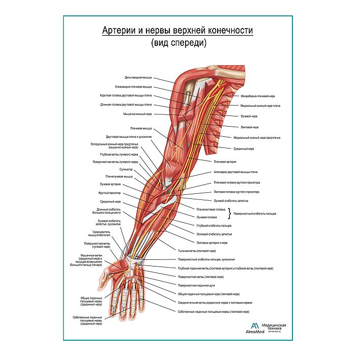 Артерии и нервы верхней конечности: вид спереди – плакат А1+/А2+