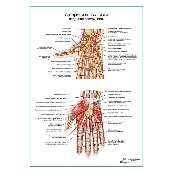 Артерии и нервы кисти, ладонная поверхность плакат глянцевый А1+/А2+