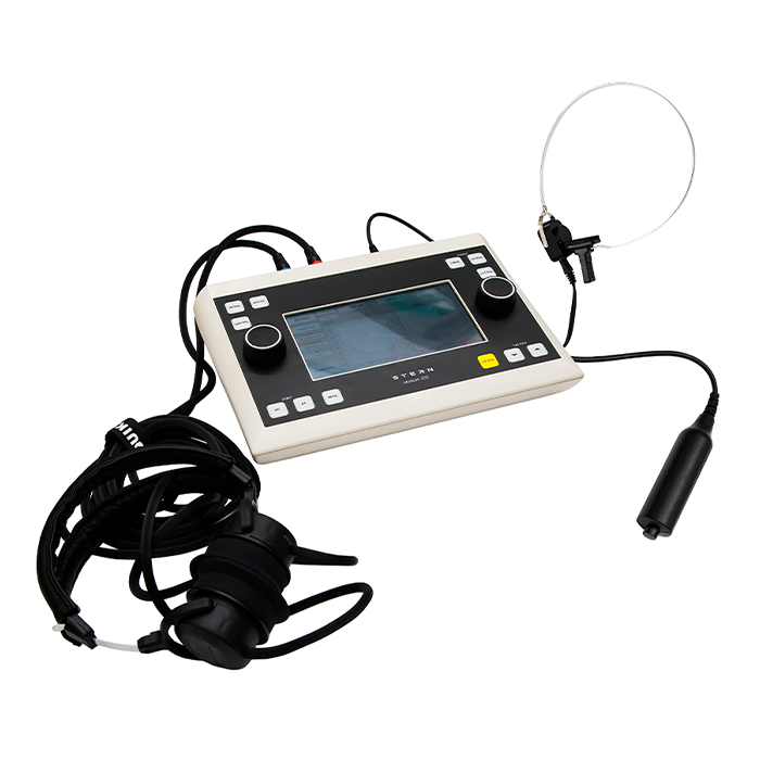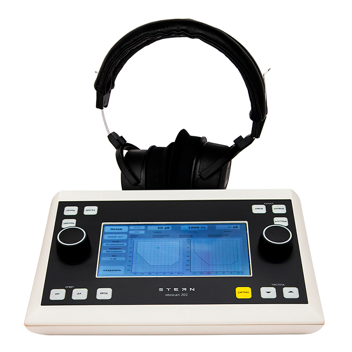 Оборудование используют, чтобы определить порог слышимости по средствам определения костного или воздушного звукопроведения