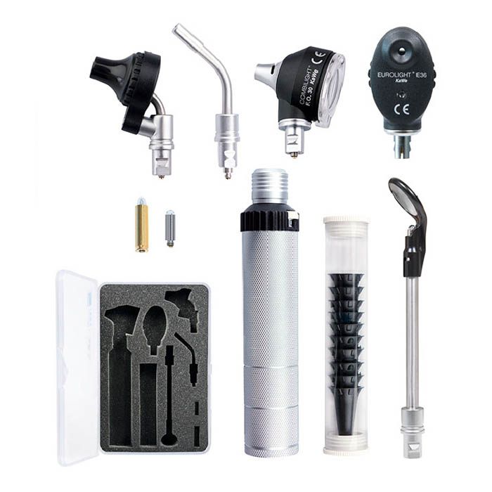 Стандартная комплектация: KaWe КОМБИЛАЙТ FO30 LED головка отоскопа KaWe ЕВРОЛАЙТ E36 головка офтальмоскопа 3,5 В Рукоятка 3,5 Многоразовые ушные воронки Ксеноновая лампа 3,5В Галогеновая лампа 3,5В Назальный осветитель Трансиллюминатор Finoff (диафаноскоп) ксенон Ларингеальное зеркло, прямое Поставляется в чёрном твёрдом кейсе * Комплектация приборов может изменяться заводом изготовителем, уточняйте у менеджера.