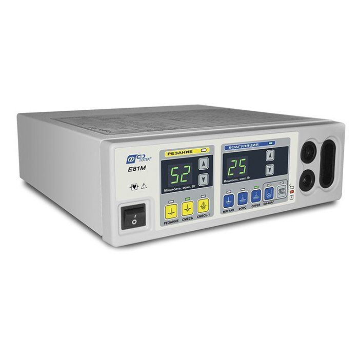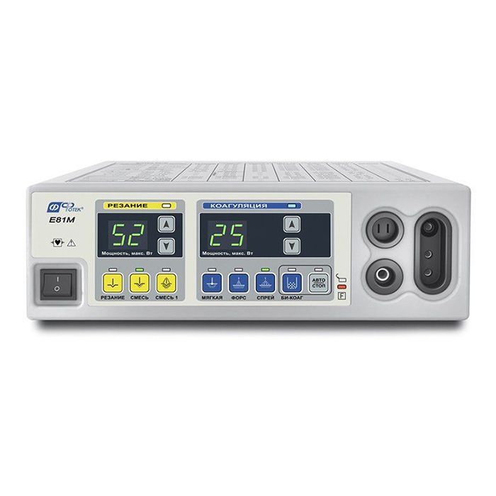 ВЧ электрохирургический блок, 90 Вт; моно: РЕЗАНИЕ, СМЕСЬ, СМЕСЬ1, МЯГКАЯ, ФОРС, СПРЕЙ; биполяр: БИ-КОАГ, АВТО-СТОП, пуск с руки
