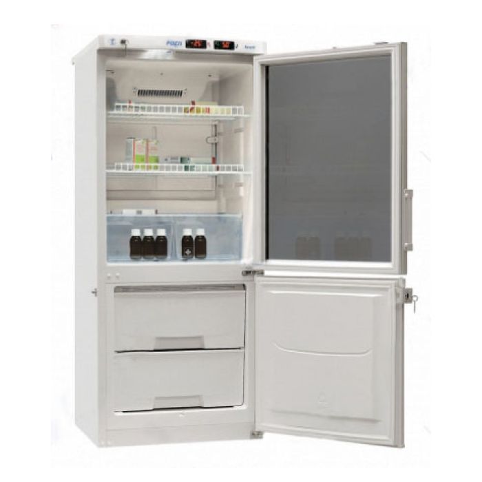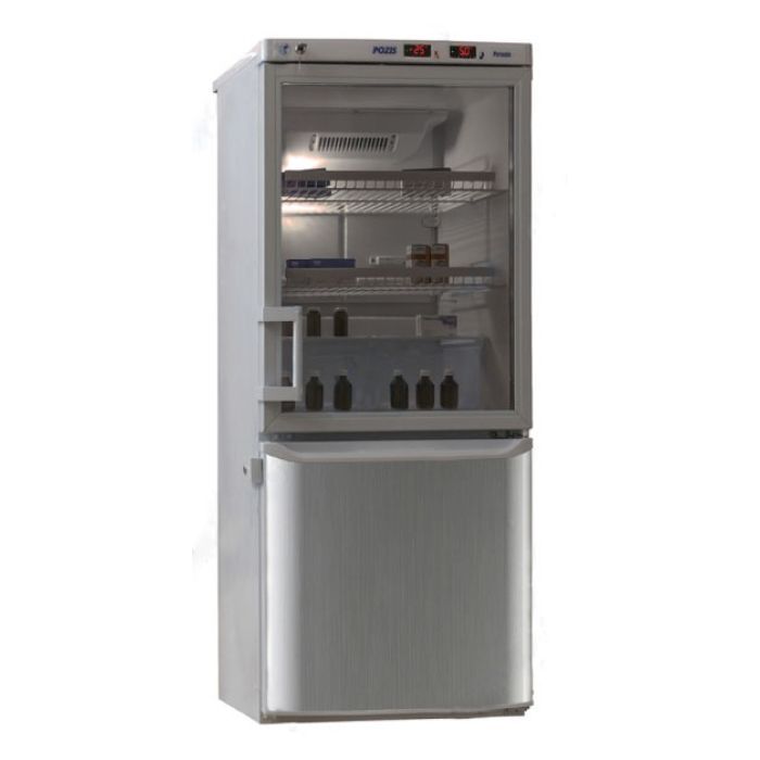 Холодильник комбинированный лабораторный ХЛ-250(ТС) ПОЗиС (170/80 л) с тонированной стеклянной дверью и дверью из металлопласта, серебро