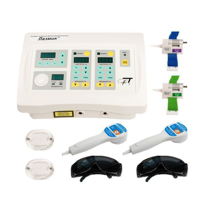 Стандартная комплектация: Аппарат лазерный терапевтический ЛАЗМИК-01. Два лазерных канала. Матричная лазерная головка импульсного излучения МЛ-904-80 (ИК лазер) Матричная лазерная головка импульсного излучения МЛ-635-40 (красный лазер) Лазерная головка непрерывного излучения КЛ-ВЛОК-365-2 (УФ лазер) Лазерная головка непрерывного излучения КЛ-ВЛОК-525-2 (зеленый лазер) Оптическая насадка ПМН – 2 шт. Световод одноразовый для внутривенного облучения крови КИВЛ-01 к аппаратам лазерным терапевтическим – 100 шт. Очки для защиты от лазерного излучения — 2 пары Комплектация приборов может изменяться заводом-изготовителем, уточняйте у менеджера.