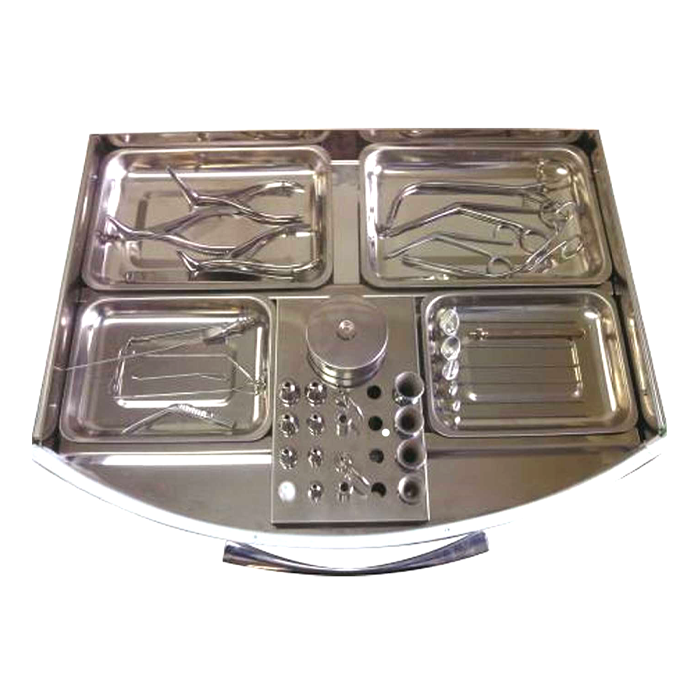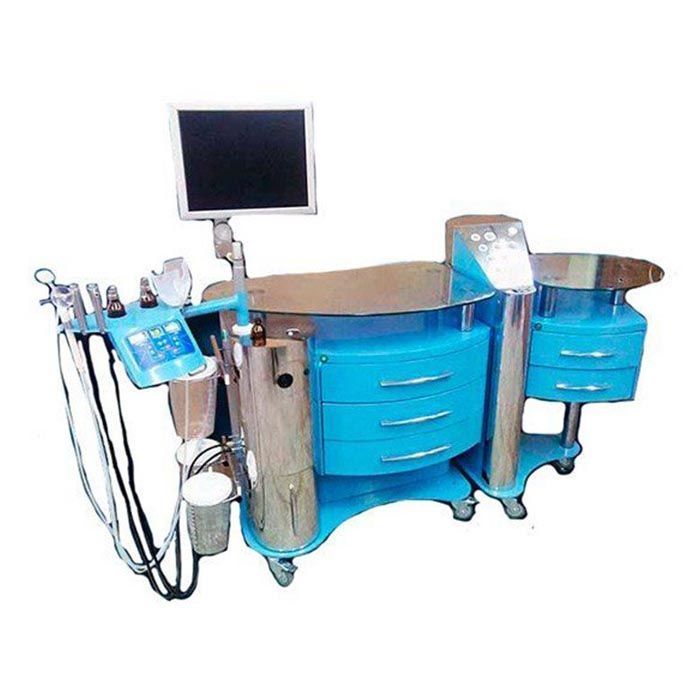 - верхний - ящик с лотками для инструмента с подогревом, ультрафиолетовой лампой;- средний - ящик с лотками для инструмента;- нижний- ящик с контейнерами для использованных инструментов;