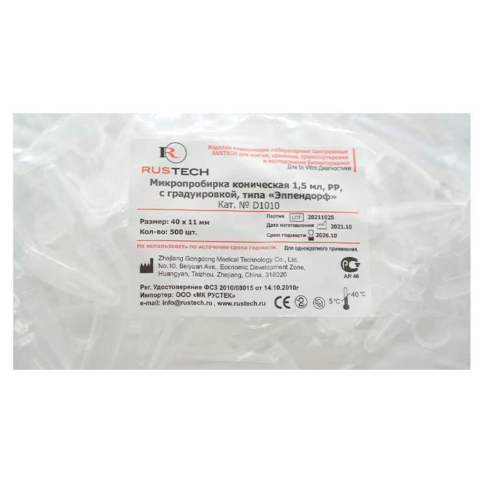 Микропробирки 1.5 мл, 11х40 мм, РР, конические, с градуировкой и местом для записи, крышка на петле, 500 шт/уп
