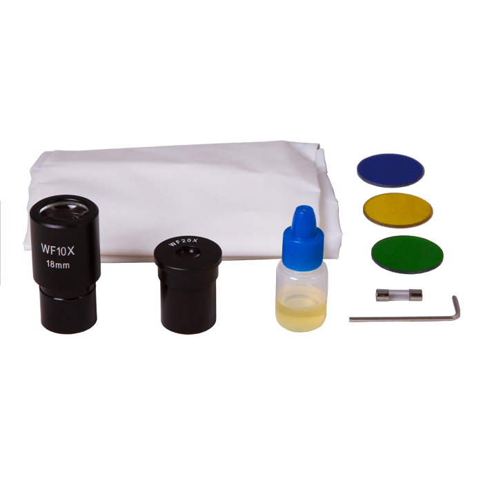 Стандартная комплектация товара: Стойка микроскопа с основанием, Монокулярная насадка, Ахроматические объективы: 4x, 10x, 40xs, 100xs (масляный), Окуляры: WF10x и WFH20x, Светофильтры: синий, зеленый, желтый, Флакон с иммерсионным маслом, Пылезащитный чехол, Сетевой адаптер (питание 220–250 В, 50 Гц), Шестигранный ключ, Запасной предохранитель, Инструкция по эксплуатации, Гарантийный талон. Комплектация приборов может изменяться заводом-изготовителем, уточняйте у менеджера.
