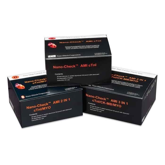 Nano-CheckTM AMI 3 in 1 (20 шт/уп): качественное и количественное определение тропонина I, миоглобина, креатинфосфокиназы-MB в цельной венозной крови, сыворотке и плазме