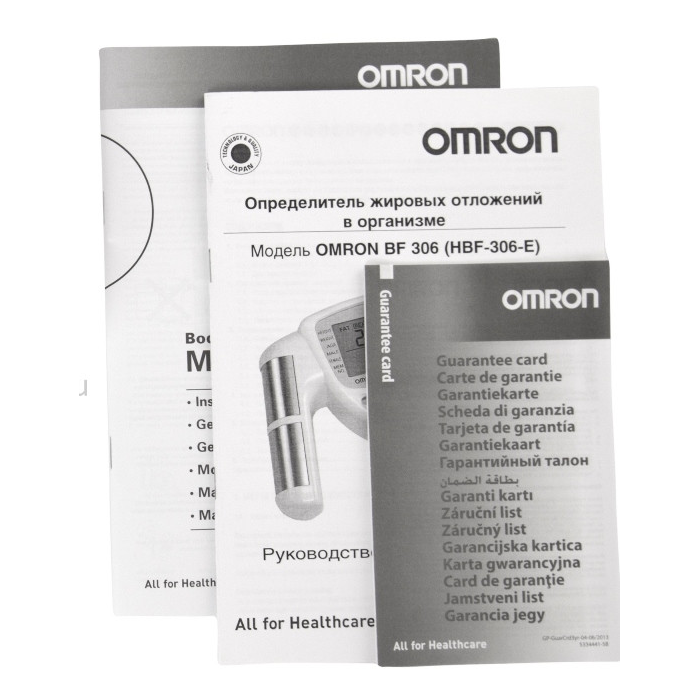 Комплект поставки прибора Omron BF-306: мизинчиковые батарейки (AAA) - 2 шт.; гарантийный талон; инструкцию по эксплуатации.
