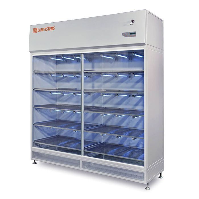 над полками установлены лампы УФ-облучения.