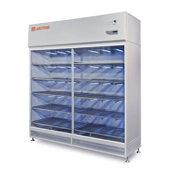 над полками установлены лампы УФ-облучения.