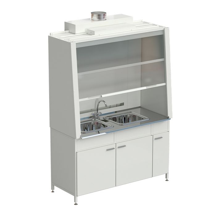 Шкаф вытяжной с двойной мойкой и ВЗБ светильником 1520х750х2160 мм, рабочая поверхность - нержавеющая сталь
