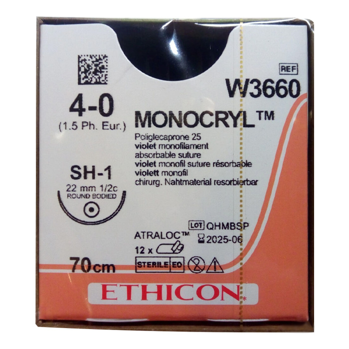 Шовный материал МОНОКРИЛ 4/0, 70 см, фиолетовый Кол. 22 мм, 1/2 – это товар для швов, предназначенный для хирургических операций.
