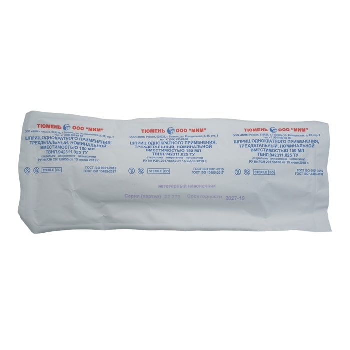Градуировка шприца: до 160 мл Обьем: 150 мл Вид упаковки: медицинская бумага + полиэтилен (блистер)
