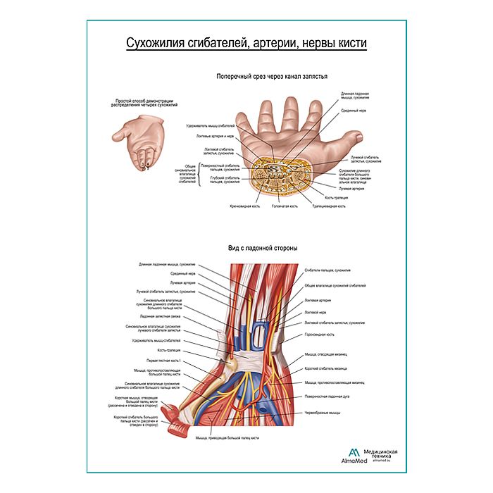 Сухожилия сгибателей, артерии, нервы кисти плакат глянцевый А1+/А2+