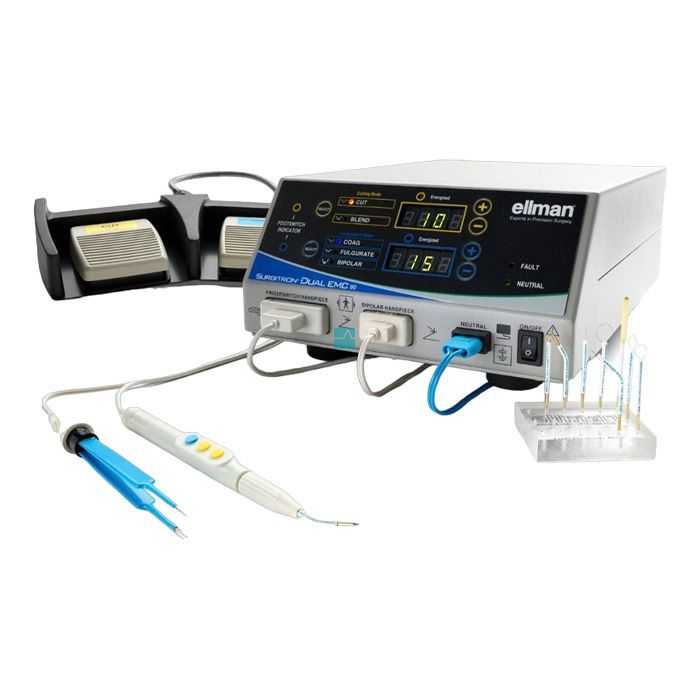Комплект поставки Surgitron Dual EMC 90 Высокочастотный хирургический радиоволновой генератор Surgitron® Dual EMC™ 90 - 1 шт.; Электроды активные монополярные (базовый комплект) - 1 шт.; Электроды активные биполярные пинцетообразные (комплект) - 1 шт.; Электроды пассивные (антенная пластина) с кабелем одноразовые (комплект) - 1 шт.; Электрод пассивный (Антенная пластина) с кабелем (стерилизуемый) - 1 шт.; Наконечник-держатель монополярный - 1 шт.; Наконечник-держатель биполярный одноразовый - 1 шт.; Двойная ножная педаль со шнуром - 1 шт.; Силовой шнур - 1 шт. - Состав базового коплекта электродов меняется по желанию покупателя и зависит от специалистов, для нужд которых приобретен аппарат. * Комплектация приборов может изменяться заводом изготовителем, уточняйте у менеджера.