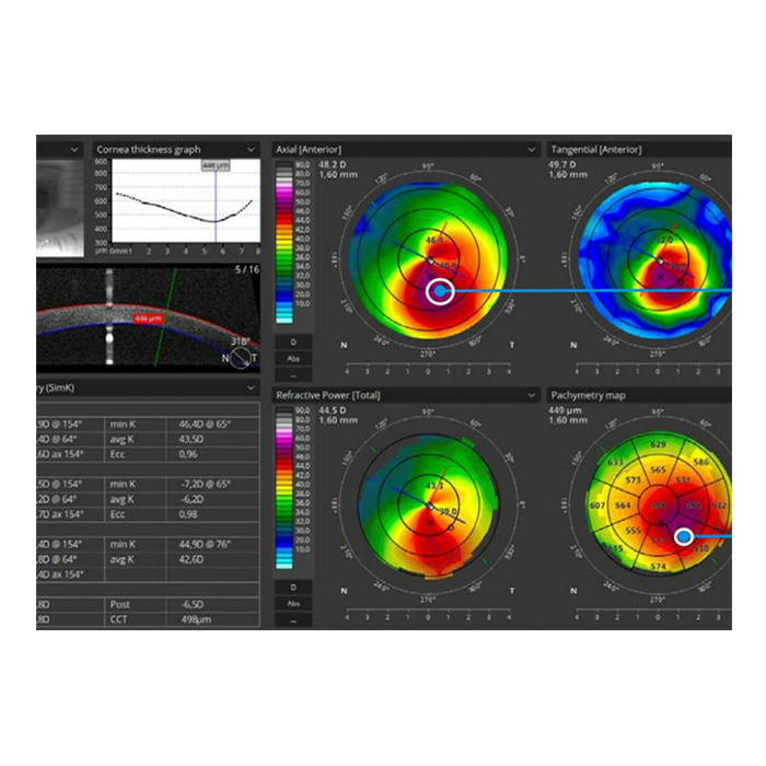 Корнеотопограф (роговичный топограф, кератотопограф) — это оборудование для бесконтактной кераметрии и измерения сферичности передней поверхности роговицы (определения кривизны роговицы) при подборе жестких газопроницаемых линз и ортокератологии. Доступна функция скрининга кератоконуса и анализа Зирке.