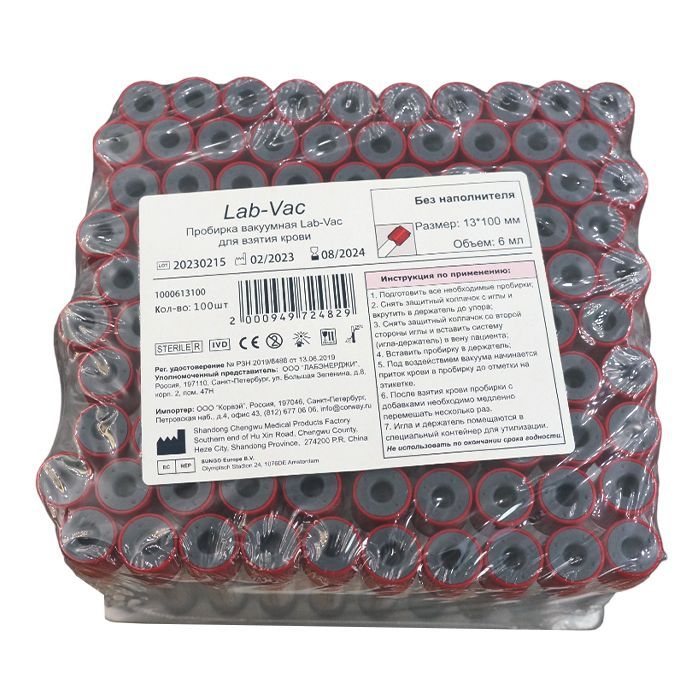 Вакуумные пробирки Lab-Vac без наполнителя, красные, 6 мл, 13х100 мм (уп. 100шт) 1000613100