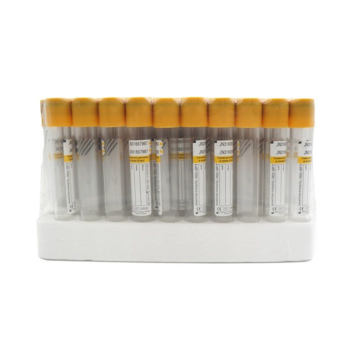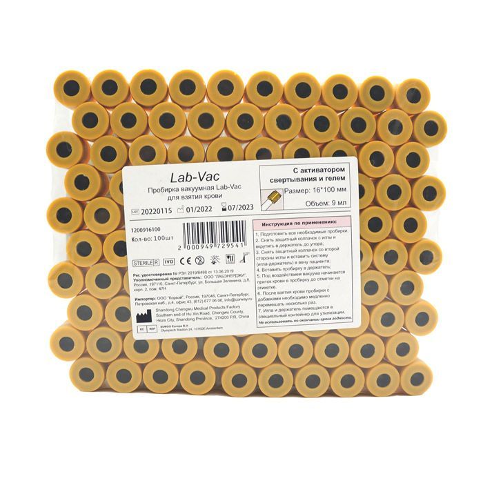 Вакуумные пробирки Lab-Vac с активатором и гелем, желтые, 9 мл, 16х100 мм (уп. 100шт) 1200916100