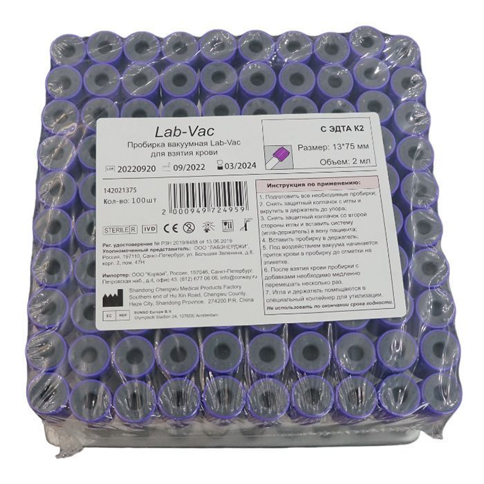 Вакуумные пробирки Lab-Vac с К2 ЭДТА, фиолетовые, 2 мл, 13х75 мм (уп. 100шт) 142021375