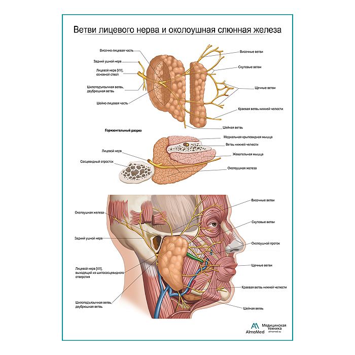 Ветви лицевого нерва и околоушная железа плакат глянцевый А1+/А2+